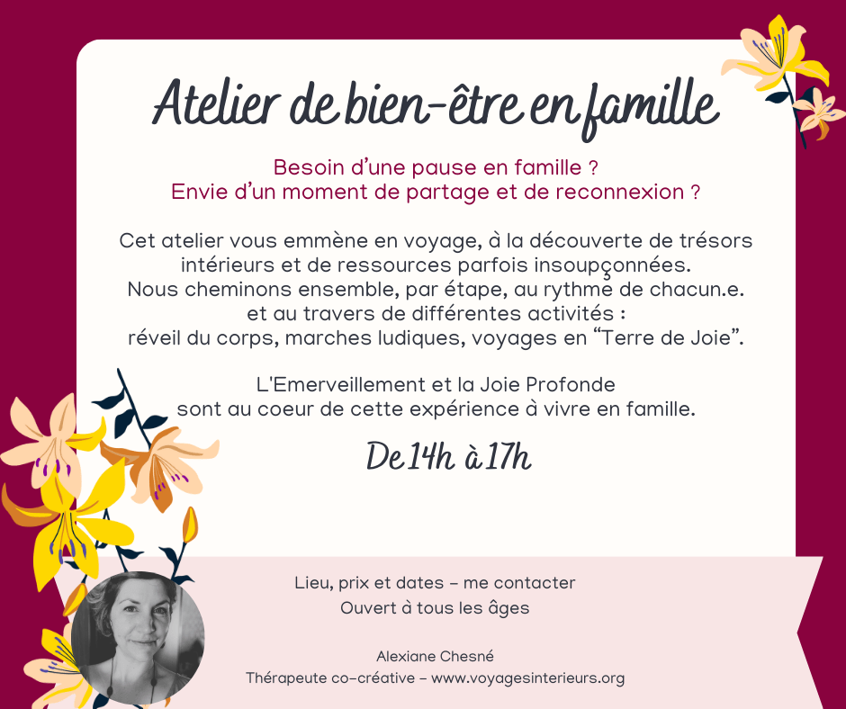 Cet atelier est aussi un aperçu du contenu de mon stage d’été pour enfants “Cultivons la Joie !”.